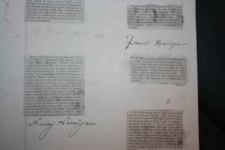 One thing I would like to submit into evidence are the signatures of Henry, Charles and Daniel (John's brother) Harrigan from the coroner's inquest. Keep in mind that the inquest was held at the Harrigan home mere hours after John's body was found by Charles in a blood-spattered room. While thankfully I have no personal experience here, I can only imagine that I would be quite shaken if I were asked to give testimony under these circumstances, especially after seeing the room and body. Before I go any further, take a look at the signatures. Click on the image to see a larger version.